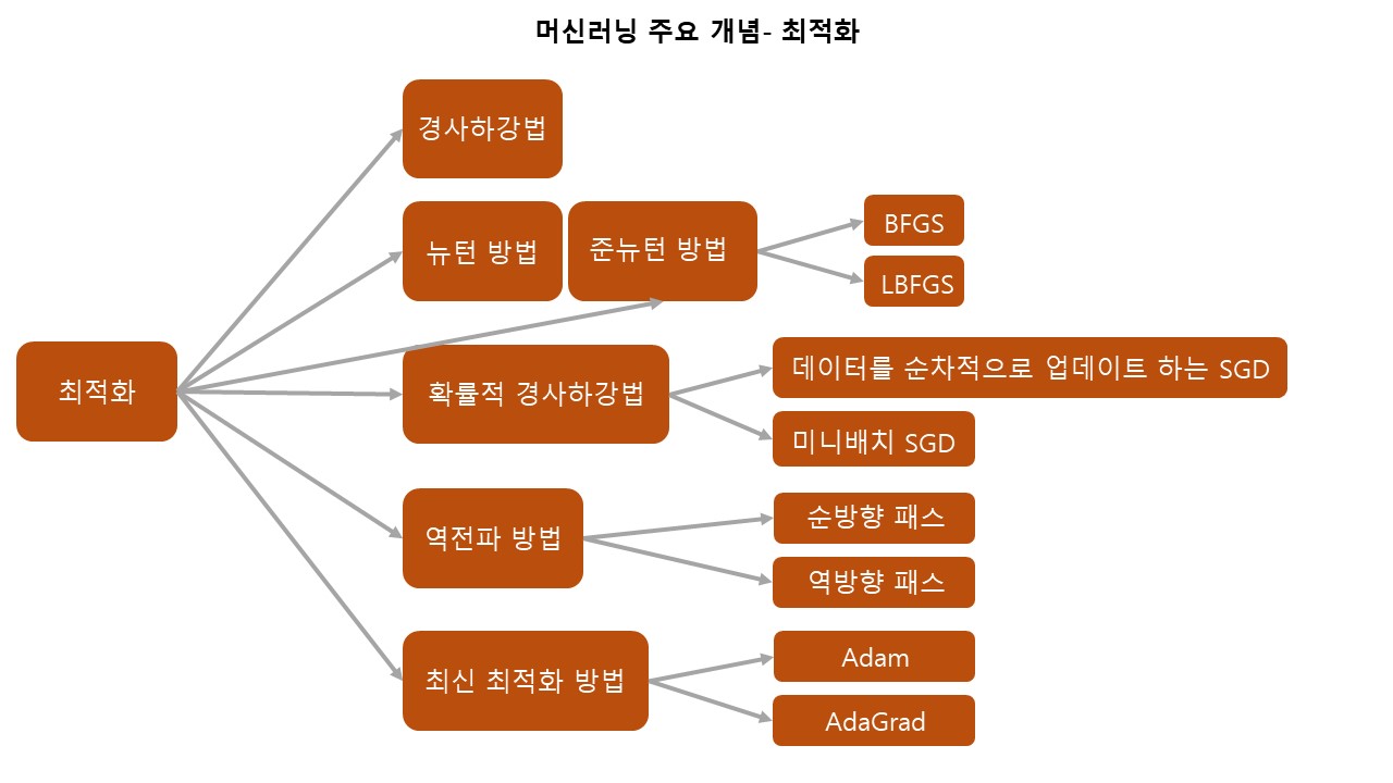 대표적으로 '경사하강법', '뉴턴/준뉴턴 방법', '확률적 경사하강법', '역전파'가 있습니다.